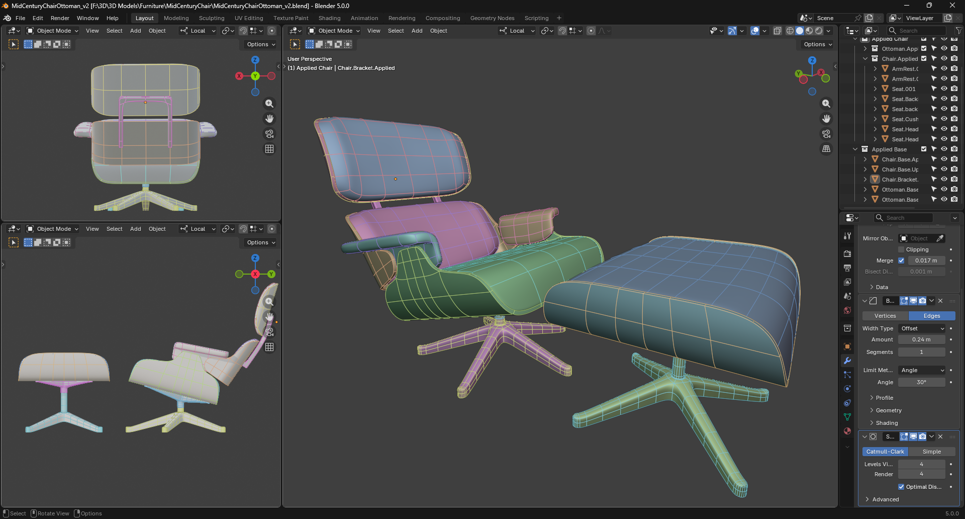 This project is a technical deep dive into cloth simulation, using a classic mid-century modern lounge chair as the canvas. The goal: push Blender's cloth physics to achieve production-ready upholstery behavior. The chair is both a standalone simulation showcase and a hero asset for a larger living space diorama.